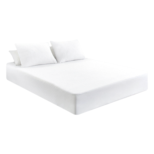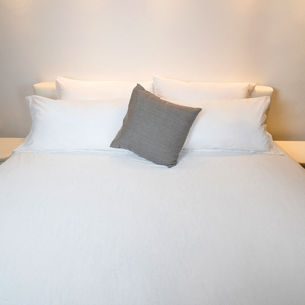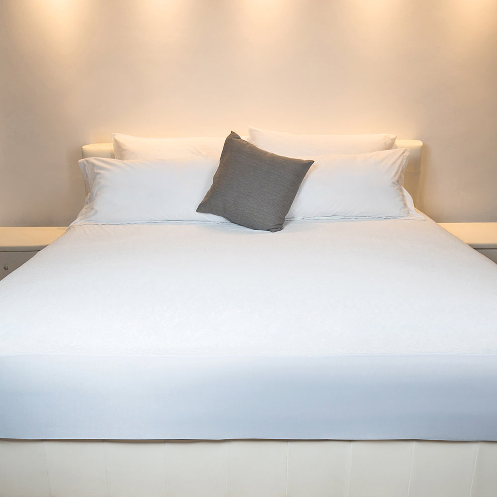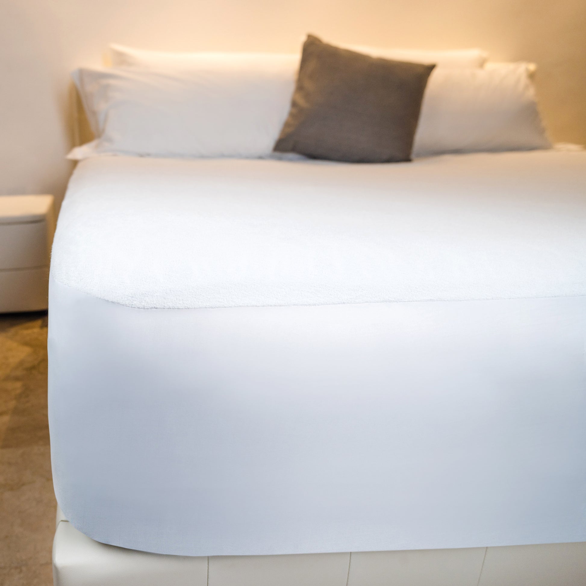 Protector de colchón impermeable con acabado de tipo toalla, ideal para habitaciones de hoteles y rentas vacacionales.